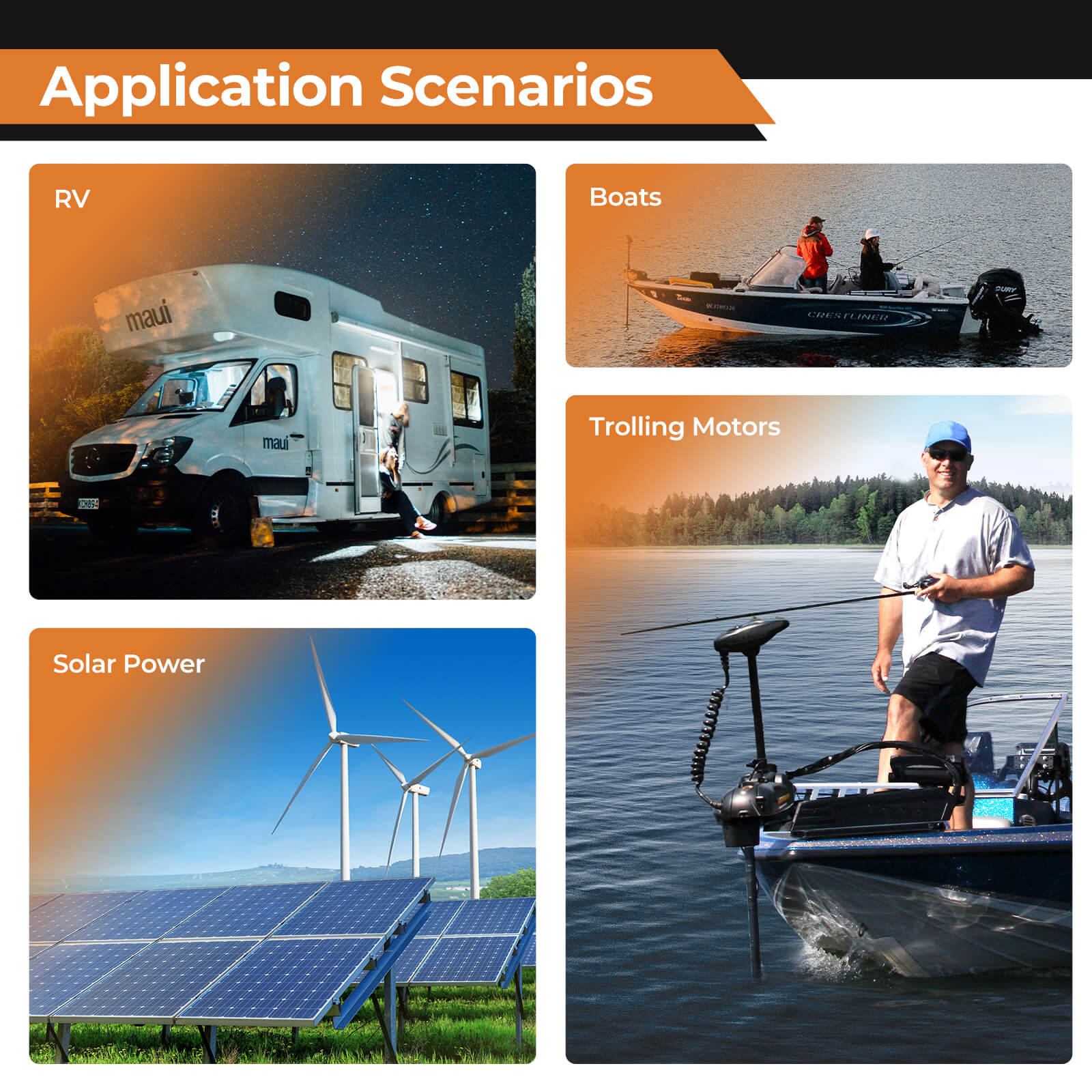 Widely used in most areas such as motorized wheelchairs, RV/trailers, Boats, Yacht, trolling motors, Solar power, Emergency Backup power, Solar off-grid Systems and more.